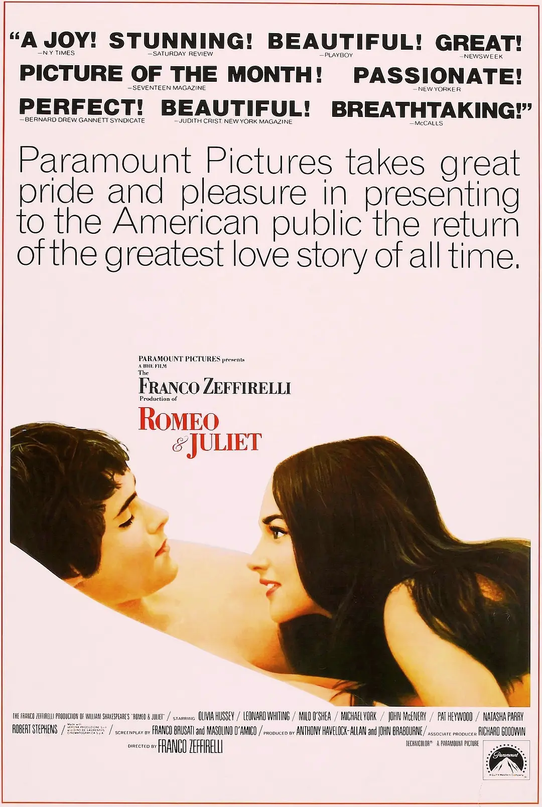 在十五世纪意大利的维罗纳城住有二家声望很高而彼此尖锐对立的望族。他们之间不断的发生血腥的争执。蒙达犹家族的罗密欧(莱昂纳德·怀廷 Leonard Whiting 饰)与卡普雷特家族的朱丽叶(奥丽维娅·赫西 Olivia Hussey 饰)。却一见钟情,私自结婚。朱丽叶的表兄挑衅罗密欧而被误杀,罗密欧因此被流放到城外。为了躲避家人逼婚,朱丽叶在神父的帮助下假死,当罗密欧知道后,赶了回来看到墓穴中熟睡的朱丽叶,绝望之余喝下毒药自杀,当醒来的朱丽叶看到爱人死后也绝望的用短剑刺入了自已的胸部殉情而死。